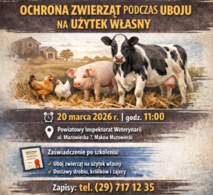Powiatowy Lekarz WeterynariiZAPRASZA na bezpłatne szkolenie teoretyczne w zakresieochrony zwierząt podczas uboju na użytek własny Szkolenie odbędzie się 20 marca 2026 r.o godzinie 11:00 w…